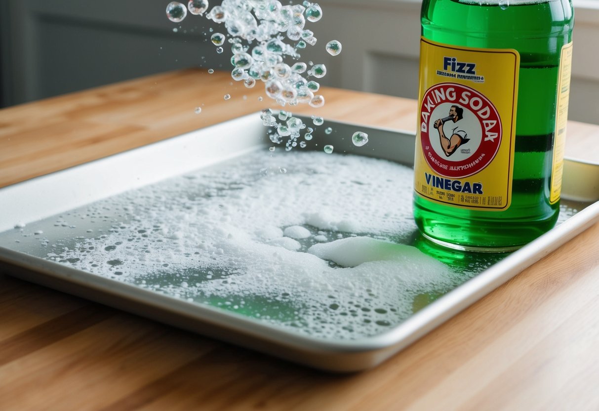 Bikarbonat och vinäger är ett effektivt sätt att rengöra ugnsplåtar. Blanda 10 matskedar bikarbonat med 3 matskedar vinäger till en smet.